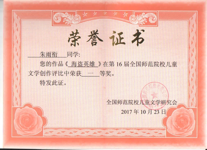 《海盗英雄》在第16届全国师范院校儿童文学创作评比中荣获一等奖