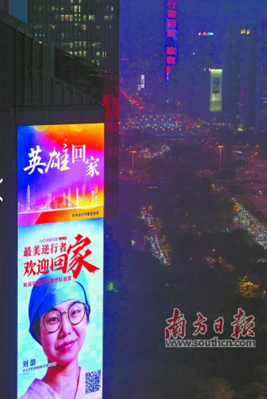欢迎英雄归来,3月20日晚,省委宣传部组织发动全省各地利用城市地标建筑以及近2000块户外LED大屏亮灯致敬从湖北战疫归来的广东医疗队。