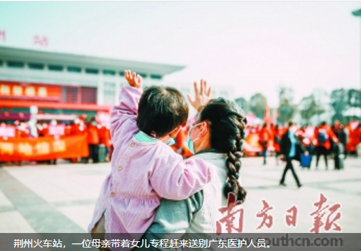 “荆生荆世,粤来粤好。”“慷慨赴荆楚,白衣作战袍。”广场上,一条条标语格外醒目。有的广东医疗队队员拿着荆州医护人员亲笔画的并肩作战的水彩画,铭记这份感情;也有队员拿着已康复的病人送来的感谢信,身虽远,心仍近。