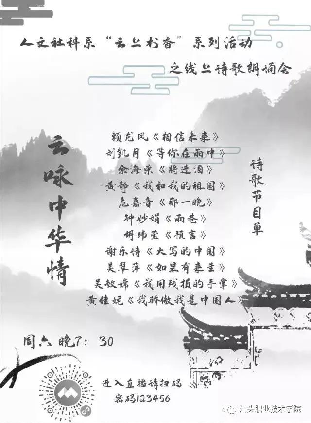 6月13日晚,人文社科系举办 “云咏中华情”线上诗歌朗诵会。此次活动是人文社科系“云上书香”线上校园文化系列活动之一。活动收到众多同学的投稿音频,经精心评选,最终选出十二位同学带着他们的朗诵作品参与本次线上诗歌朗诵会。