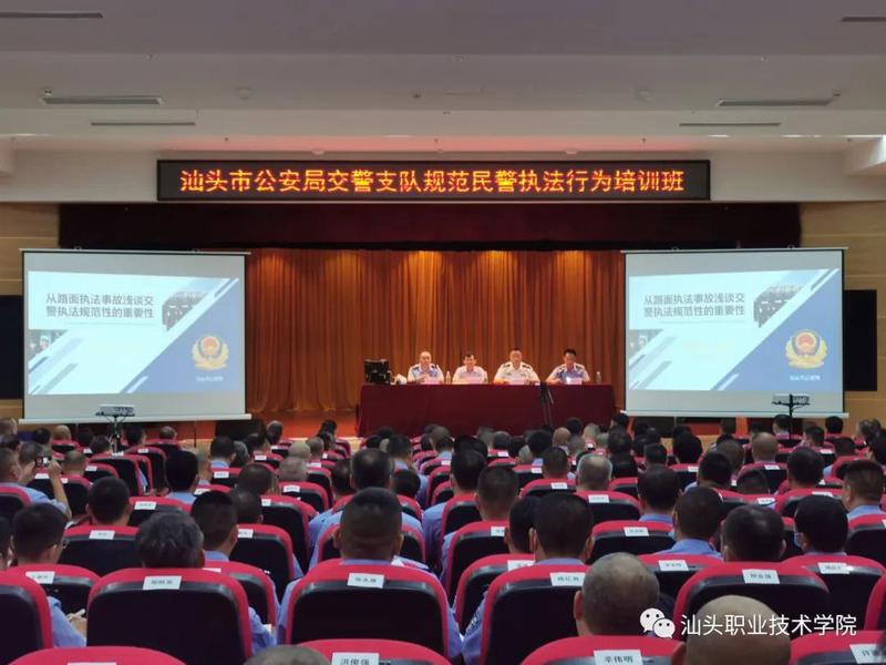 为进一步加强我市公安交警支队的队伍教育培训工作,提升交警队伍的业务水平和执勤、执法服务能力,努力促进公安交警工作和队伍建设,更好推进我市交通秩序整治“百日行动”,7月14日,由市公安局交警支队主办,学院承办的“规范民警执法行为培训”、“交警支队民警素质提升培训”活动在金园校区顺利开班。学院党委委员、副院长陈庭照,市公安局党委委员、副局长郭德庆,市交警支队支队长杜冬青出席了开班仪式,杜支队长作开班动员。陈副院长要求全体学员增强“等不起”的紧迫感、“慢不得”的危机感、“坐不得”的责任感,珍惜机会,认真投入培训学习,提升工作能力、增强工作本领,为汕头加快经济特区发展、建设省域副中心城市、打造现代化沿海经济带重要发展贡献智慧和力量。