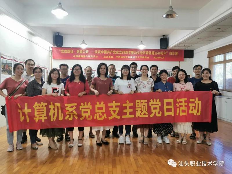 7月16日下午,计算机系党总支全体党员在党总支书记刘钦创带领下,到市机关书画院参观“党旗飘扬·党徽闪耀——庆祝中国共产党成立99周年暨汕头经济特区建立40周年”摄影展。