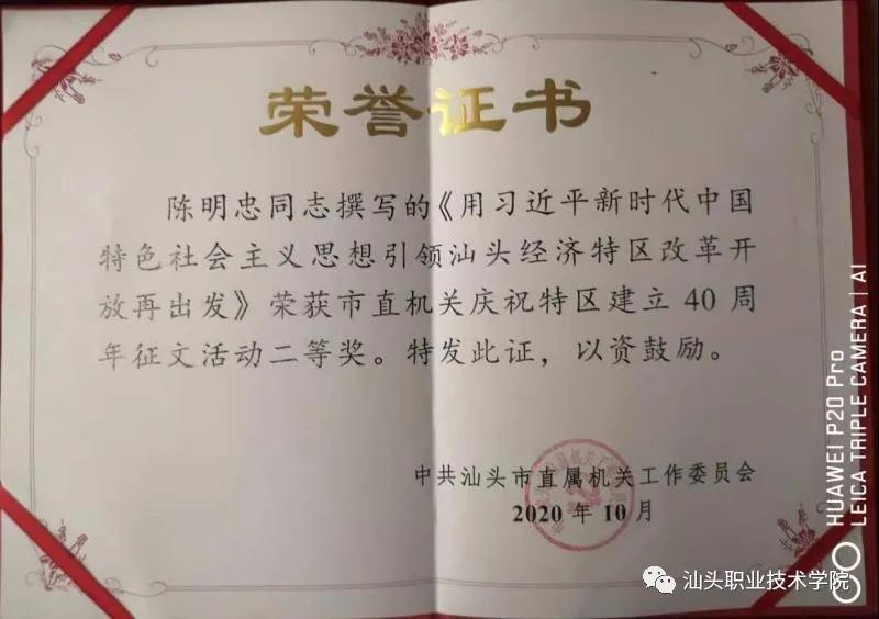 近日,由市直机关工委组织开展的“用习近平新时代中国特色社会主义思想引领汕头经济特区改革开放再出发”征文活动获奖名单揭晓,机电工程系党总支书记陈明忠撰写的《改革开放不停步,推动汕头经济特区再发展 ——用习近平新时代中国特色社会主义思想引领汕头经济特区改革开放再出发》一文在此次征文活动中荣获二等奖。