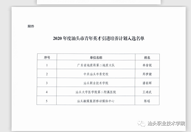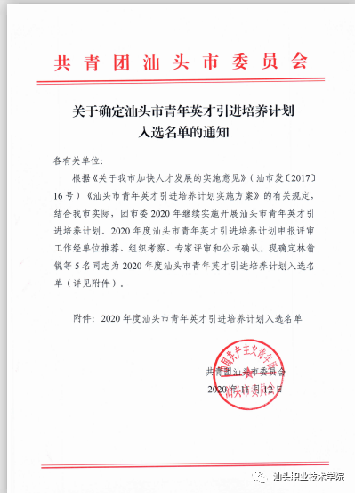 为贯彻落实党的十九大精神,大力实施创新驱动发展战略,进一步深化人才发展体制改革,加快建设人才高地,根据《中共汕头市委印发〈关于我市加快人才发展的实施意见〉的通知》精神,团市委开展实施了汕头市青年英才引进培养计划,每年资助不超过30名40周岁以下的优秀青年人才或者新引进博士研究生到海内外一流大学、研究机构进行项目研究或者开展合作研究。团市委近日公布了2020年度入选名单,我院经济管理系潘丽辉副教授入选。