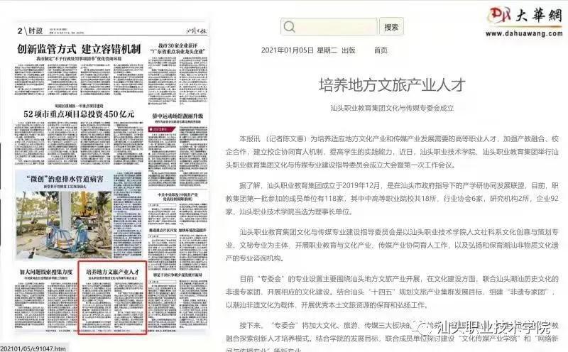 1月1日,《汕头新闻》专题报道了职教集团文化与传媒专业建设指导委员会(下称“文化与传媒专委会”)成立大会,以及人文社科系近几年专业发展和校企合作的工作成果。《汕头日报》和“橄榄台”等本地主要媒体也同步采访。文化与传媒专委会成立于2020年12月28日,是在汕头职业教育集团指导下的专业建设咨询机构。专委会邀请汕头融媒集团担任主任单位,并吸纳职教集团23家文化或传媒领域的优秀企业、协会、非遗传承单位加入。专委会的成立,为人文社科系文化创意与策划专业、文秘专业发展提供校企合作平台,为人文社科系专业设置和创建“专业群”提供咨询意见,以及为人文社科系的“潮汕非遗文化”特色活动增添新力量。除了专委会的成立,《汕头新闻》介绍了人文社科系近年来的工作成果和未来发展方向:一是紧密围绕学院未来的发展方向,在文化产业和传媒产业领域推进产学研工作,搭建专委会作为平台,配合职教集团企业申报“产教融合型企业”或“现代产业学院”;二是在职教集团的引领下,积极利用专委会各成员单位的资源,跟踪汕头市文化和传媒产业的发展状况,逐步改造原有专业或新增一些专业,积极探索“文化服务”高水平专业群,为我市“十四五”期间发展现代服务业、文旅产业输送合适的人才;三是根据学院“创新强校”工程的绩效目标,以潮汕文化为载体,联合专委会中的传媒企业和非遗传承单位制作一系列影视作品。目前正在制作的《从零开始学潮语》《童谣里的潮汕》等系列短片,将潮汕地区的风土人情通过潮汕话、潮汕童谣等非遗项目串起来,通过影视化制作后,最终呈现在各大媒体上面,为拓展学院影响力、弘扬保育潮汕文化做一点事情。(人文社科系)
