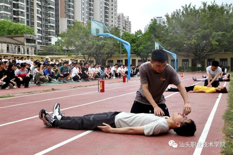 撤离至操场后,学院退伍复学的张琦同学还演示了灭火器使用方法,讲述了使用灭火器时的注意事项;自救互救小队进行心肺复苏演练,让同学们学习如何正确运用心肺复苏方法。