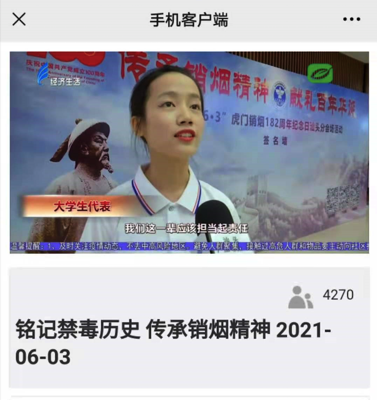 根据疫情防控需要,这次活动采取全程网上直播开展,全市各区县禁毒办、市禁毒委成员单位同步线上观看直播。汕头市禁毒委领导到会并致辞。活动设置了歌曲、小品、舞蹈、诗朗诵等节目助兴。我院19级社区管理与服务专业学生以手语舞《风中的羽翼》献礼纪念活动,舞蹈动作流畅优美,表演富有感染力,赢得了在场新闻媒体关注,李凤真同学代表参演团队对汕头电视台今日视线记者表达了:“实现中国梦、我辈当自强”青春感悟。