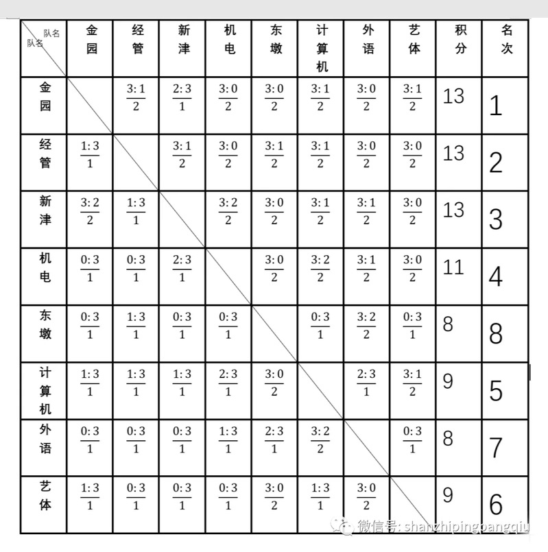 第二天的团体赛的激烈程度和前一天相比则是有过而无不及。在一系列“搓切扣摆”以及一阵阵过“乒乒乓乓”的声音中,团体赛也落下帷幕。男子团体循环赛冠军是金园校区代表队,亚军是经济管理系代表队,季军是新津校区代表队。