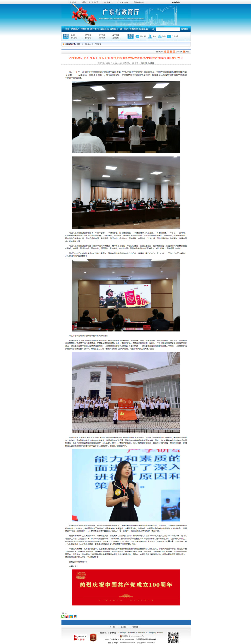 广东省教育厅2021-07-02刊登我院简讯《百年风华 再启征程!星空彩票了单双四肖组织收听收看庆祝中国共产党成立100周年大会》