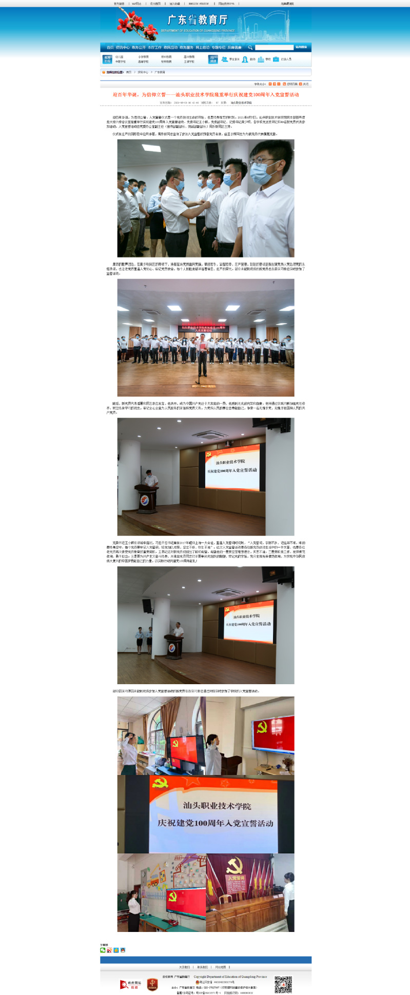 广东省教育厅2021-06-09刊登我院简讯《迎百年华诞,为信仰立誓——星空彩票了单双四肖隆重举行庆祝建党100周年入党宣誓活动》
