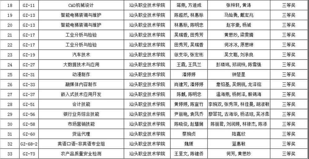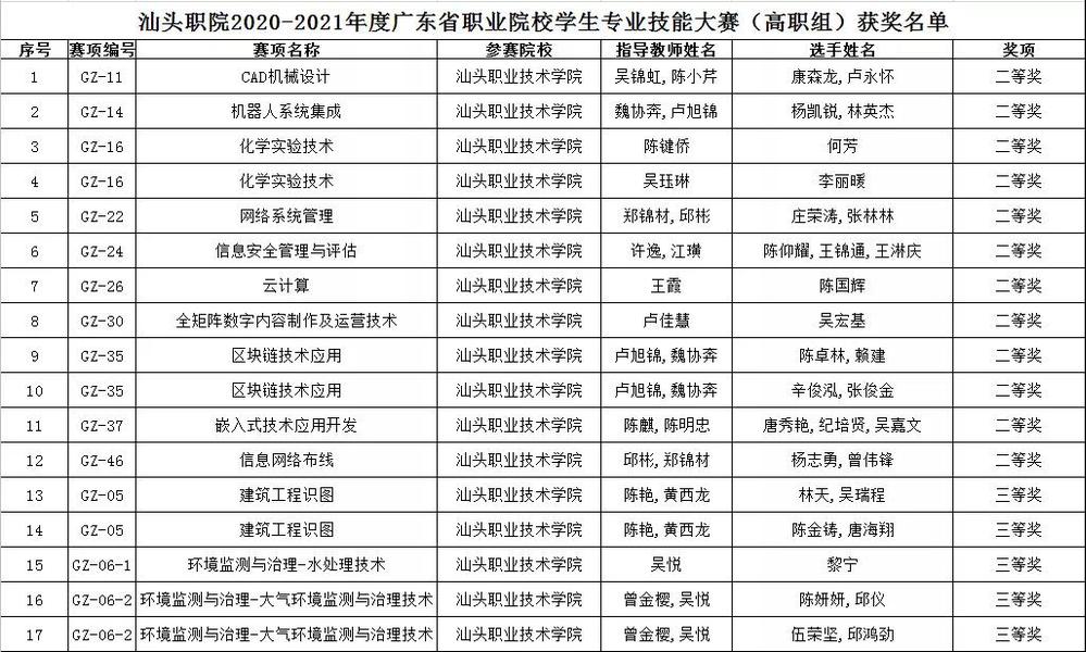 2020-2021年度广东省职业院校学生专业技能大赛,我院选派47支队伍参加38个赛项比赛,经过激烈角逐,已完成所有赛程。比赛成绩经广东省教育厅公示后,已于近日公布,我院获三等奖(含)以上等次的团队33队。其中12队获二等奖,分别是:机电工程系选派的CAD机械设计、机器人系统集成、2个区块链技术应用、嵌入式技术应用开发5个团队;计算机系选派的网络系统管理、信息安全管理与评估、云计算、全矩阵数字内容制作及运营技术、信息网络布线5个团队;自然科学系选派的2个化学实验技术团队。本年度的省职业院校学生专业技能大赛组织过程中,学院党政领导班子高度重视,大力支持技能实训中心开展工作,鼓励各学系要克服新冠疫情等困难积极组织参赛。技能实训中心根据《广东省教育厅办公室关于做好2020-2021年度全省职业院校学生专业技能大赛有关工作的通知》及学院领导指示精神认真制订《学院组织参加2020-2021年度省职业院校大学生技能大赛工作方案》,印发了《汕职院关于做好2020-2021年大学生职业技能大赛报名及赛前准备工作的通知》(汕职院实训〔2021〕03号),对省职业院校学生专业技能大赛进行广泛宣传和组织动员,得到各学系的积极响应。同时,组织开展校内院、系两级学生技能竞赛活动常规工作,落实“以赛促学,以赛促教,以赛促建”的教学思想,培养学生的创新意识、实践能力和团队精神。各赛项经过初赛、决赛等不同层次的比赛,为培养、选拔省技能大赛团队及选手创造有利条件。在比赛期间,各学系负责同志和赛项的指导老师本着严谨治学、诲人不倦的精神对学生进行培训和指导;在比赛现场,同学们更是沉着应战、精诚团结、奋勇拼博力争赛出优异成绩。本年度广东省职业院校学生专业技能大赛在全学院师生共同努力下,圆满完成竞赛任务,取得可喜成绩,进一步提升了学院学生的职业技能和综合素质。在此,对获奖的选手和指导老师(名单详见附件)表示祝贺!同时,感谢您们的辛勤付出,预祝明年再创佳绩。附件:汕头职院2020-2021年度广东省职业院校学生专业技能大赛(高职组)获奖名单