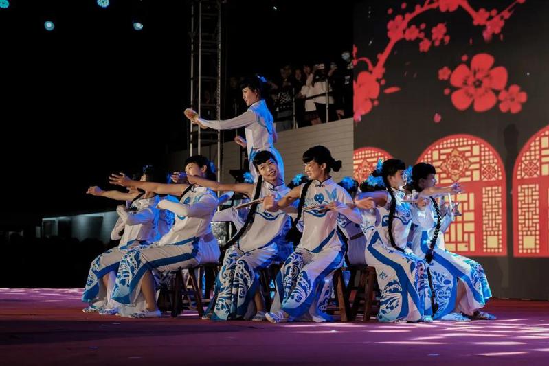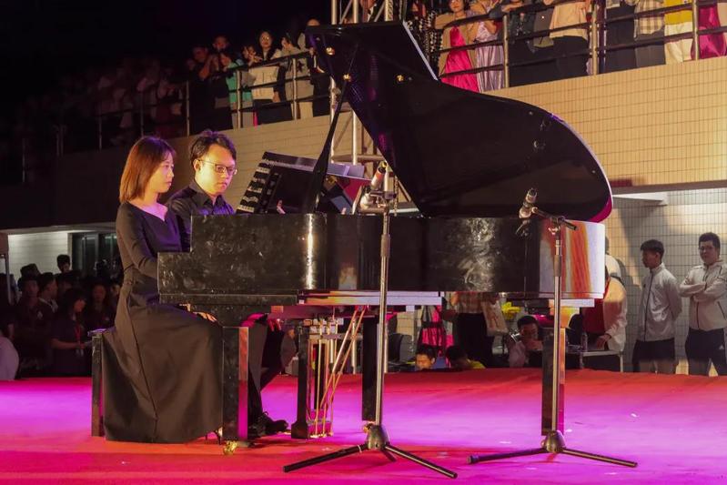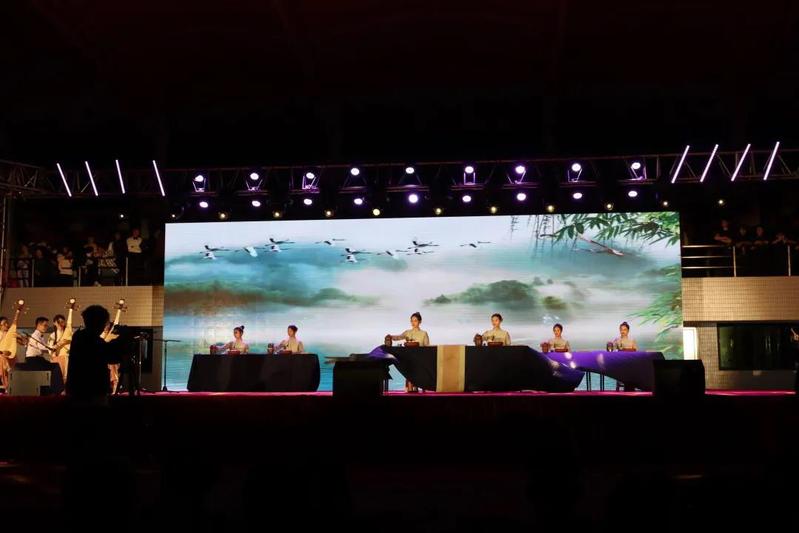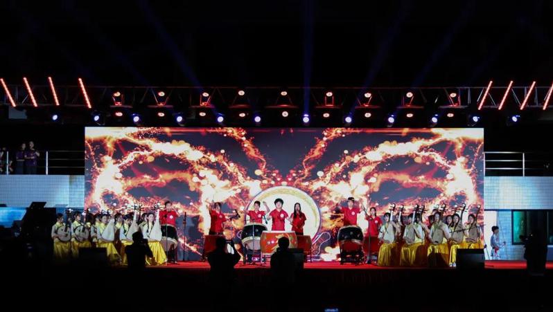 此刻聚光灯汇聚舞台,照亮汕职的有月色星光,也有台上大放异彩的青年学生们,唯美动听的器乐交响,合奏出云宫动人的华音,夜晚的氛围在乐器声中渐浓。在民族鼓、琵琶合奏《龙腾虎跃》《金蛇狂舞》中,迎新晚会正式开始。