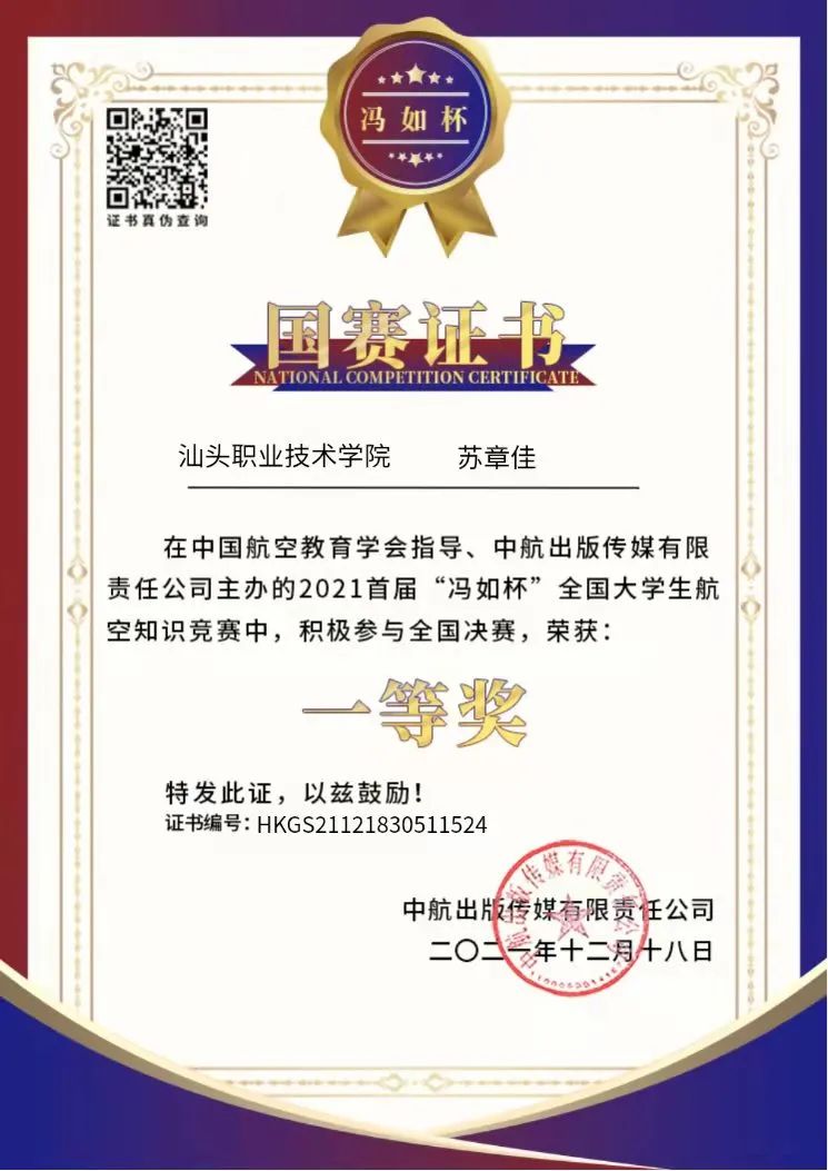 近日,我院计算机系2021级计算机应用技术1班苏章佳同学在由中国航空教育学会指导、中航出版传媒有限责任公司主办的2021首届“冯如杯”全国大学生航空知识竞赛中荣获一等奖,同时被授予“追光青年宣传大使”称号。