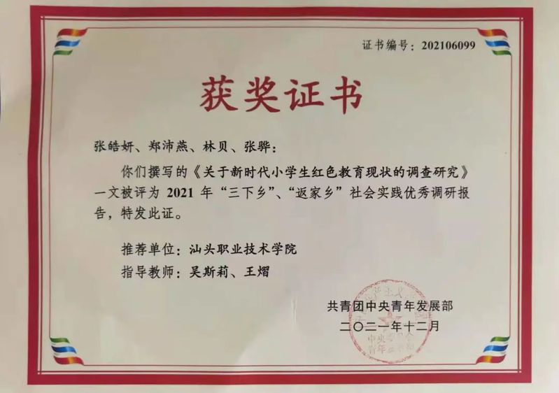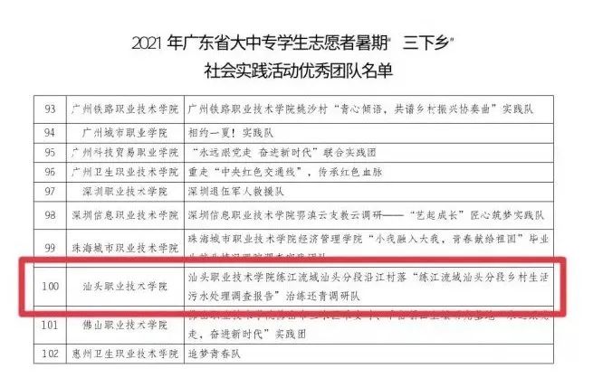 在广东省学生联合会通报的2021年大中专学生志愿者暑期文化科技卫生“三下乡”社会实践活动结果中,我院1支团队荣获优秀团队,吴悦、李鸿伟、何嘉熙等三位师生荣获优秀个人。