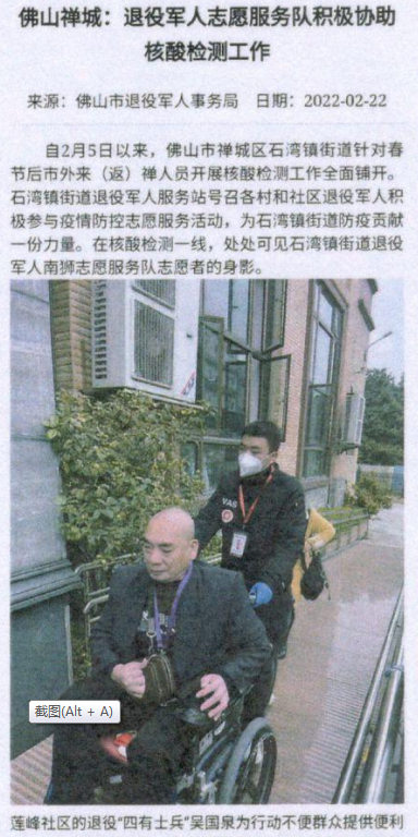 吴国泉,我院退役复学军人,曾服役于新疆某部及西藏某部,是我军第一批进入中印边境对阵前线的战士,于2021年9月退伍复学,现就读我院外语系21级商务英语2班。从西藏阿里卫国戌边的优秀战士,到退役复学继续圆“大学梦”,吴国泉褪去了稚嫩,扛起了更多的责任与担当,秉持军人本色,服务地方、服务社会。今年寒假,吴国泉同志主动到佛山市禅城区石湾镇街道退役军人服务站实习,并担任石湾镇街道退役军人南狮志愿服务队队长,活跃在疫情防控、核酸检测、重点人群排查及健康管理、重点服务场所人流管控、疫苗接种的工作中,积极参与新春给老兵送温暖送喜报活动、为行动不便老兵上门打扫卫生贴春联,面对任务重、标准严、时间紧的情况,依然很好地完成各项工作任务,展现出优秀的退伍军人素质和踏实的工作作风,得到禅城区及街道领导、同事们的好评,事迹在广东省军人事务厅、佛山市退役军人事务局官网上刊登报道。石湾镇街道退役军人服务站向我院发来表扬信。