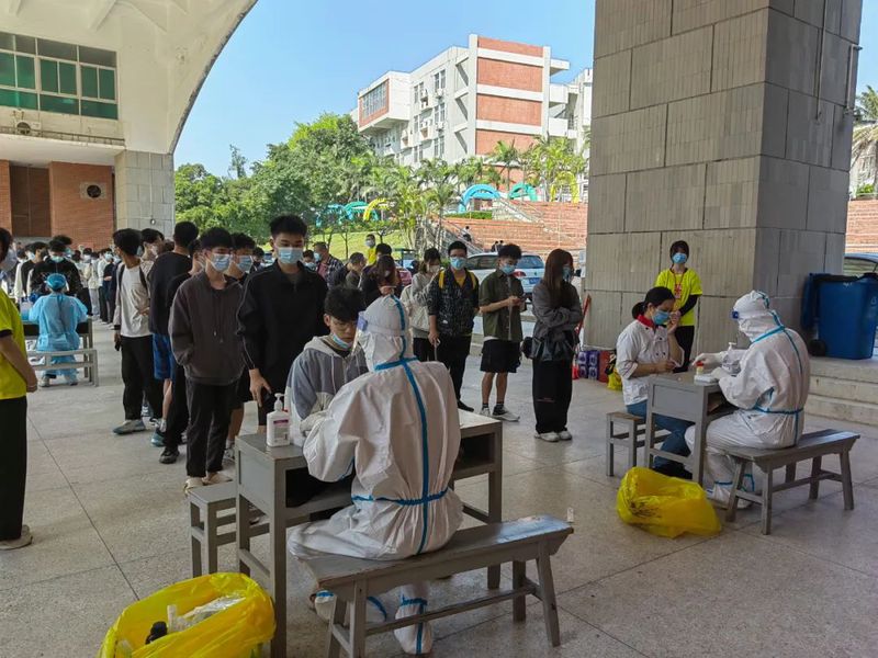 在核酸检测现场,参检师生全程佩戴口罩,严格做好个人防护,听从现场工作人员及志愿者的指挥,有序地完成了本次核酸检测工作。
