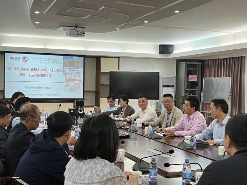 实地调研走访后,方小铁副书记一行在广东金明精机股份有限公司三楼会议室召开座谈会。汕头轻工装备企业联盟董事长许鹏对方副书记一行的到访表示热烈欢迎,并介绍了目前联盟企业的用工需求和技术服务需求,希望机电工程系推荐更多教师、精英参与联盟企业的技术攻关,推荐更多毕业生加入联盟企业的大生产中。