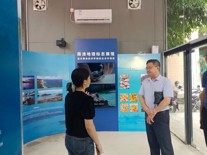 林副院长一行首先查看了“南澳地理标志展馆”的建设成果,该项目的VI设计制作和VR视频部分由人文社科系文化创意与策划专业师生配合企业完成,特别展示了南澳地理标志产品——紫菜、牡蛎的养殖捕捞的虚拟场景,项目落成以来已多次接待省市领导的调研,受到南澳县电子商务公共服务中心的高度评价。