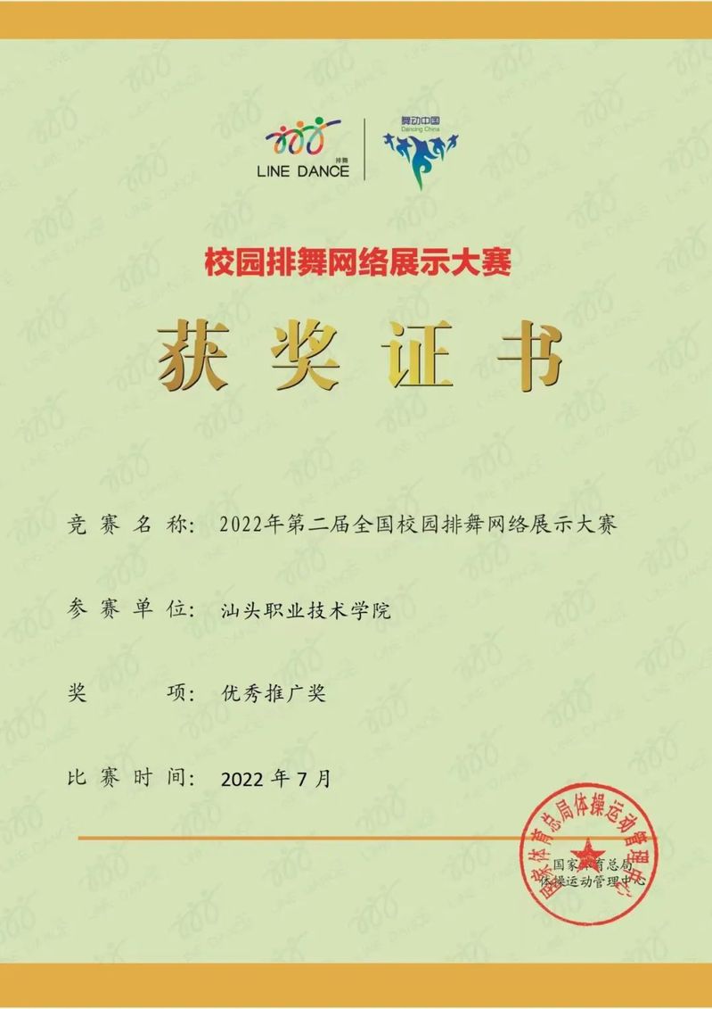 7月1-3日,我院在2022年第二届全国校园排舞网络展示大赛中荣获高校组B组规定项目三等奖与优秀推广奖。此次大赛我院共派出220名运动健儿参加,在艺术体育系体育专业教研室钟昭金老师的精心指导下,运动健儿们在镜头前展示作品《我和我的国》共庆建党101周年,赢得荧幕前观众和评委的喝彩与点赞。