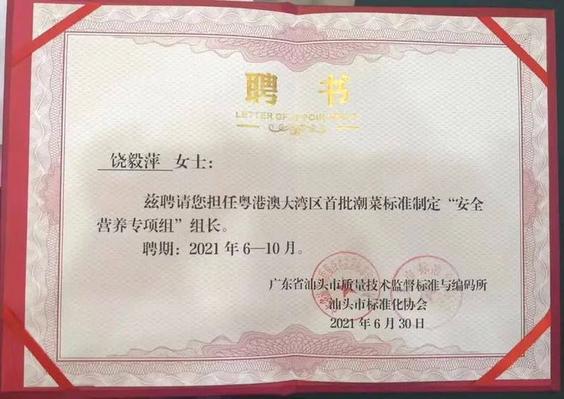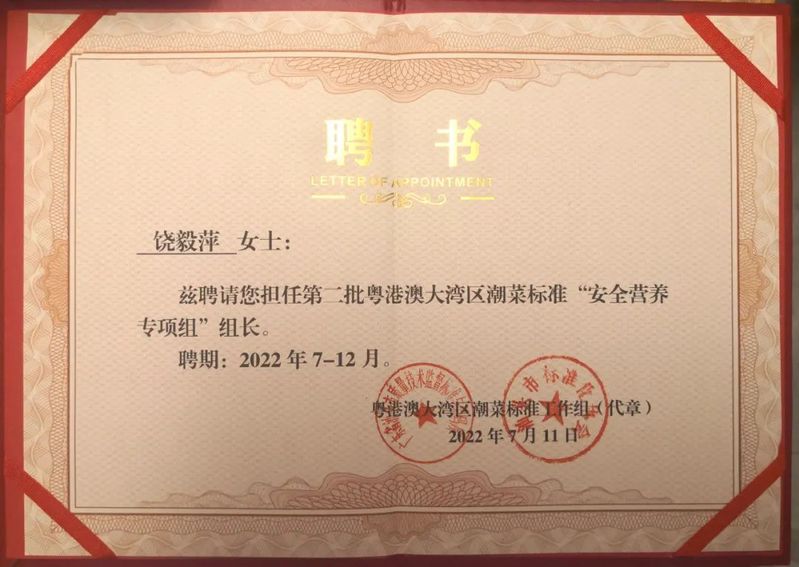 我院饶毅萍副教授被聘任为粤港澳大湾区首批、第二批潮菜标准制定“安全营养专项组”组长。我院饶毅萍副教授被聘任为粤港澳大湾区首批、第二批潮菜标准制定“安全营养专项组”组长。