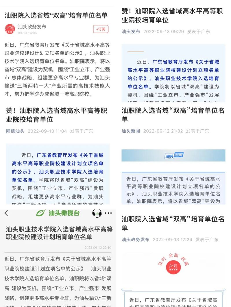 日前,广东省教育厅发布《关于省域高水平高等职业院校建议计划立项名单的公示》,我院入选省域”双高”培育单位名单,汕头政务发布公众号及南方号、汕头发布、汕头新闻、网信汕头、汕头橄榄台APP等多家官媒对此进行集中报道。