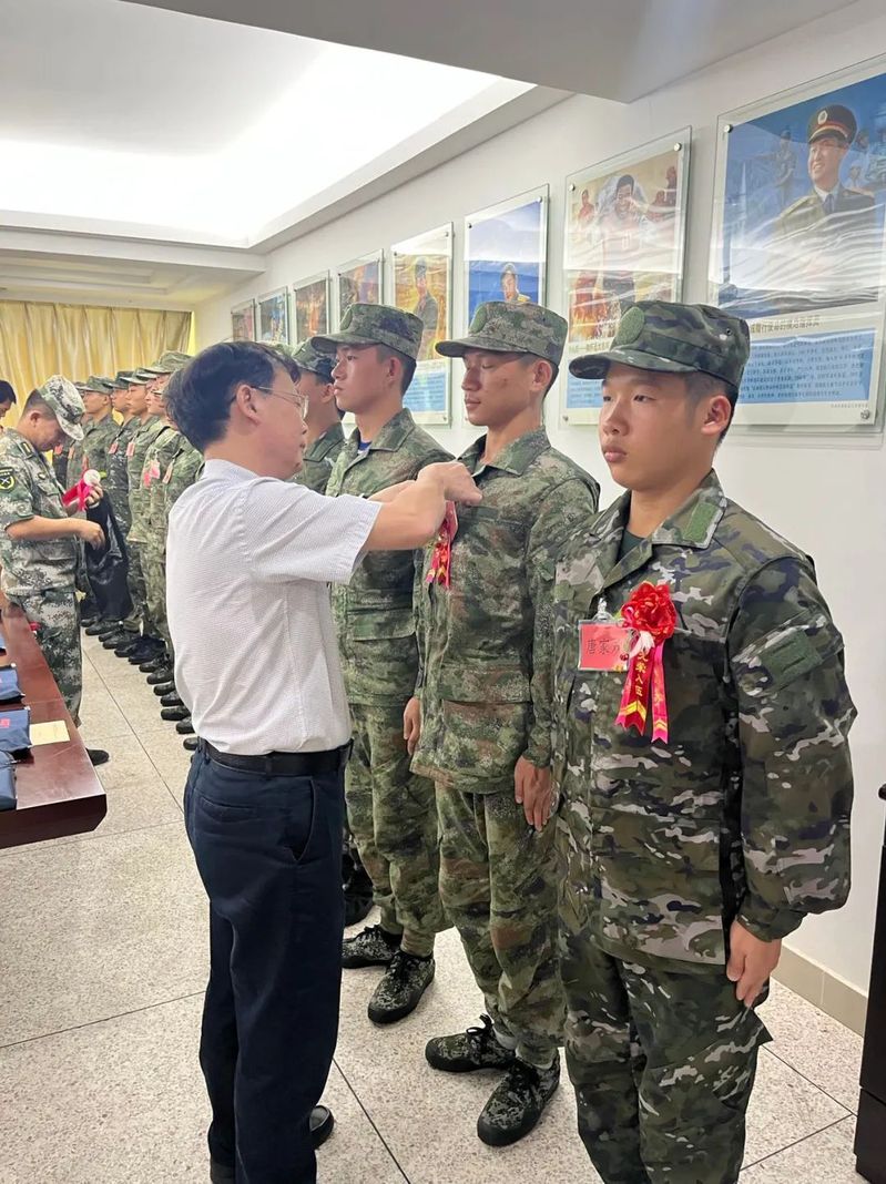 陈庭照副院长和杨广超部长一一为新兵佩戴光荣花,陈庭照副院长对新兵们经过层层选拔成为光荣的士兵表示祝贺,同时提出殷切期望,叮嘱新兵们要心怀感恩,感谢祖国的信任和部队的选择;要珍惜机会,到祖国最需要的地方去;要听从指挥,服从命令,练就过硬的军事技能。他要求学院人民武装部落实好各项优惠政策,让新兵们服役暖心,退役安心。