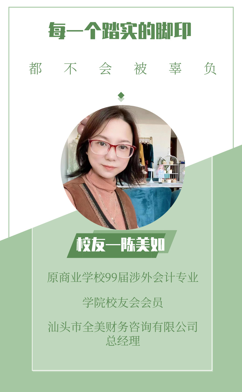 二十多年前,从小对做生意感兴趣、对数字敏感、对自我目标清晰的陈美如校友选择了到原汕头商业学校(现汕职院新津校区)就读涉外会计专业。