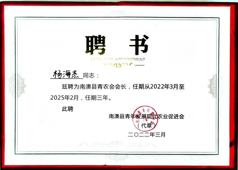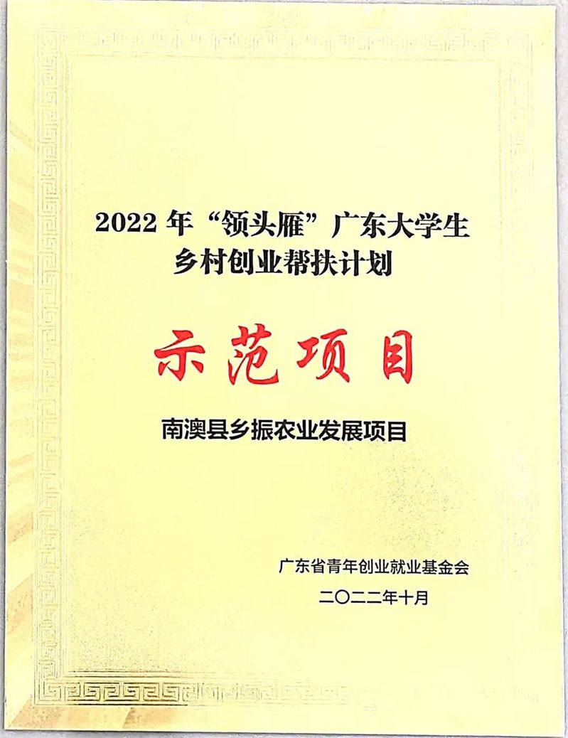 在广东省青年创业就业基金会联合相关单位举办的2022年“领头雁”广东大学生乡村创业帮扶计划中,杨海杰校友作为南澳乡振农场负责人,其示范项目获得了中国青年创业就业基金会直接资金资助。以“公司+农户”模式助力乡村、振兴农场。志力为南澳乡村振兴事业贡献一份青春力量。