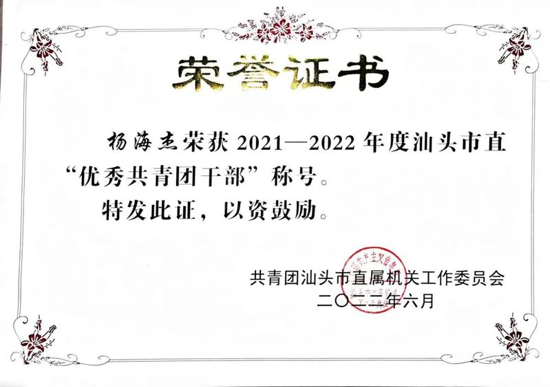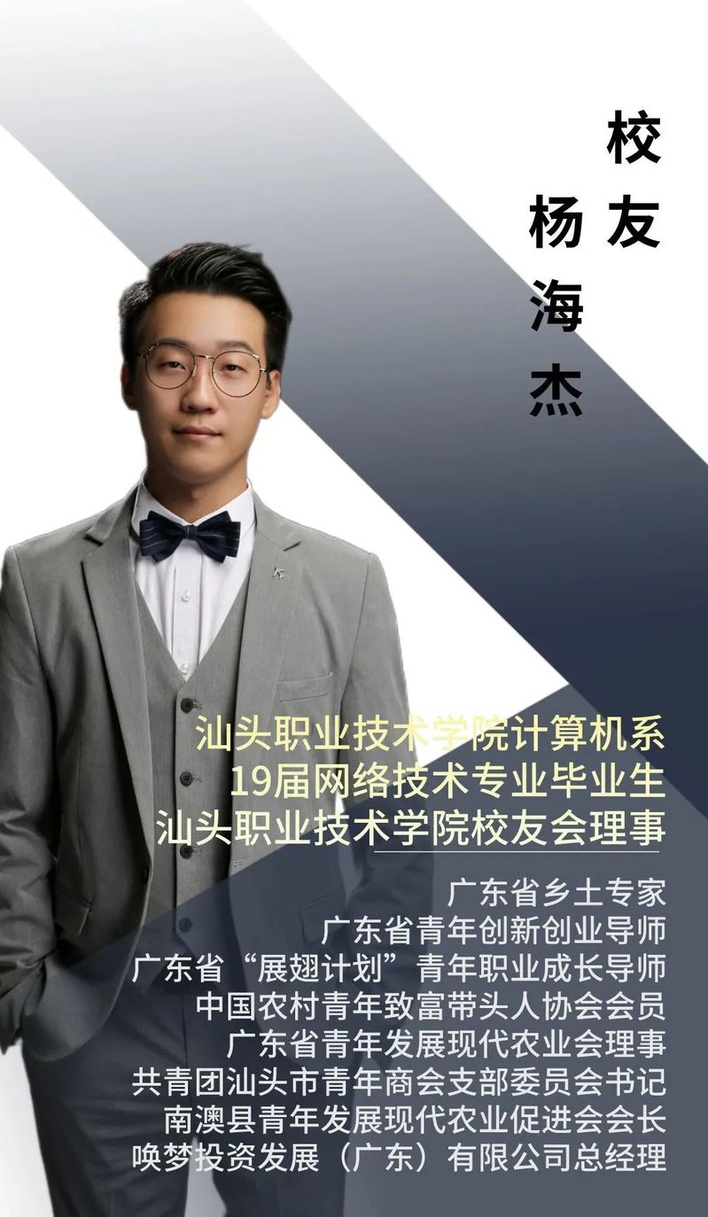 本期访谈校友--计算机系19届网络技术专业杨海杰校友,他其曾多次参与创新创业比赛,荣获多次省、市比赛奖项与荣誉称号。2017年荣获汕头市“互联网+”创新创业大赛团队优秀奖、在第八届“创青春”汕头青年创新创业大赛中荣获创意组铜奖、2017年在广东众创杯大学生启航赛暨“赢在广东”第六届大学生创业大赛中荣获项目创新奖、2019年荣获“我是超级创业者-2019年青蓝国际创新创业大赛”优胜奖、第四届中国“互联网+”大学生创新创业大赛广东省分赛“青年红色筑梦之旅”赛道中荣获“青年红色筑梦之旅”赛道优秀创新创业项目奖、2021年“创青春”广东青年文化和旅游创新创业大赛中荣获乡村文旅组二等奖、2022荣获汕头市直“优秀共青团干部”称号等。