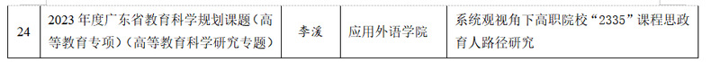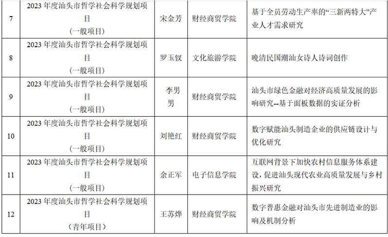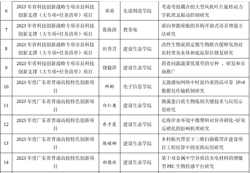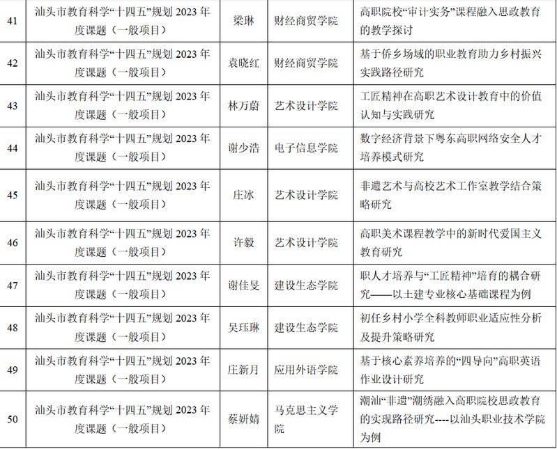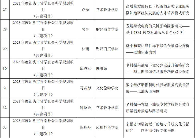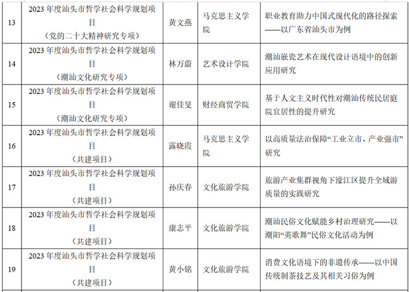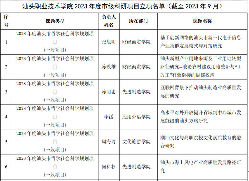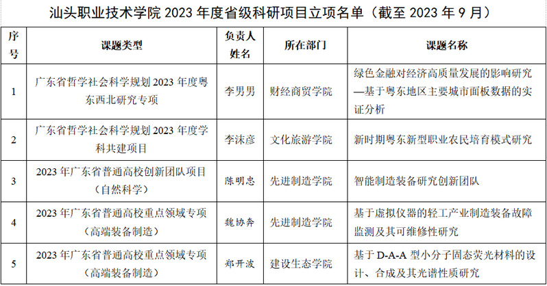 截至2023年9月底, 我校2023年度省级科研项目立项24项,其中广东省哲学社会科学规划项目2项、广东省普通高校创新团队项目1项、广东省普通高校重点领域专项项目2项、广东省科技创新战略专项市县科技创新支撑(大专项+任务清单)项目4项、广东省普通高校特色创新项目5项、广东省普通高校青年创新人才项目3项、广东省教育科学规划课题7项。我校2023年度市级科研项目立项50项,其中汕头市哲学社会科学规划项目40项,汕头市教育科学“十四五”规划立项课题项目10项。具体名单如下: