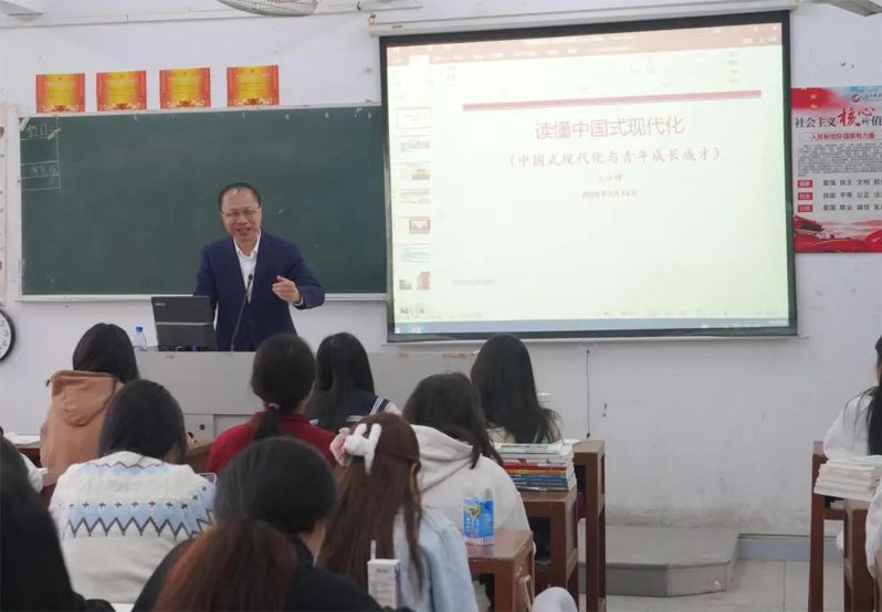 3月14日上午,王小辉以《读懂中国式现代化--中国式现代化与青年成长成才》为题,在新津校区1号楼302教室为财经商贸学院2023级市场营销专业学生讲授“思政第一课”。围绕中国共产党对中国式现代化的不懈探索,以历史逻辑和实践逻辑为切入点,带领同学们重温了中国式现代化的发展历程和理论创新,揭示中国式现代化的内在逻辑,阐述中国式现代化的科学内涵和时代意义。王小辉勉励同学们,要厚植家国情怀,涵养进取品格;树立远大理想,不负时代重托;把握好校园时光,做好人生规划;接过强国建设、民族复兴的接力棒,创造属于新青年的业绩和荣光。