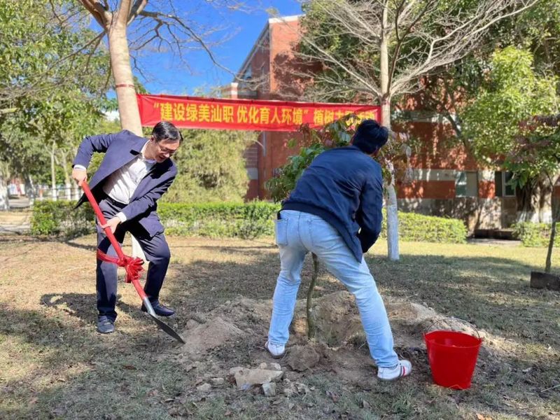 春风吹新绿,植树正当时。3月12日,我校各职能部门、二级学院师生代表在校本部开展“建设绿美汕职 优化育人环境”植树主题活动,提升校园生态环境质量,建设绿美生态校园,以实际行动做绿水青山就是金山银山理念的积极传播者和模范践行者,助力绿美汕头生态建设和“百千万工程”走深走实。学校副校长黄汉文出席活动。