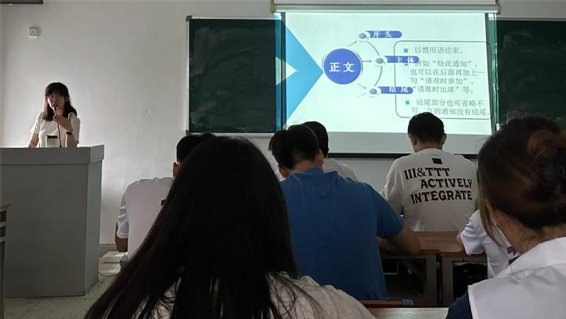 培训现场,陈典老师为同学们进行“公文写作”授课。她结合格式要求、常见问题等方面详细讲解了“通知”及“请示”两个文种的相关写法及注意事项等,帮助同学们在以后的学习和工作中能够更好地运用公文写作。