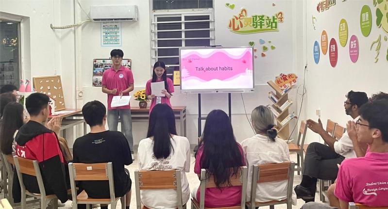529晚,应用外语学院在教二区A406举办爱生节活动之英语角。活动设置三个环节,分别为游戏环节“正话反说”、阅读环节“如何养成良好的习惯”和自由讨论。