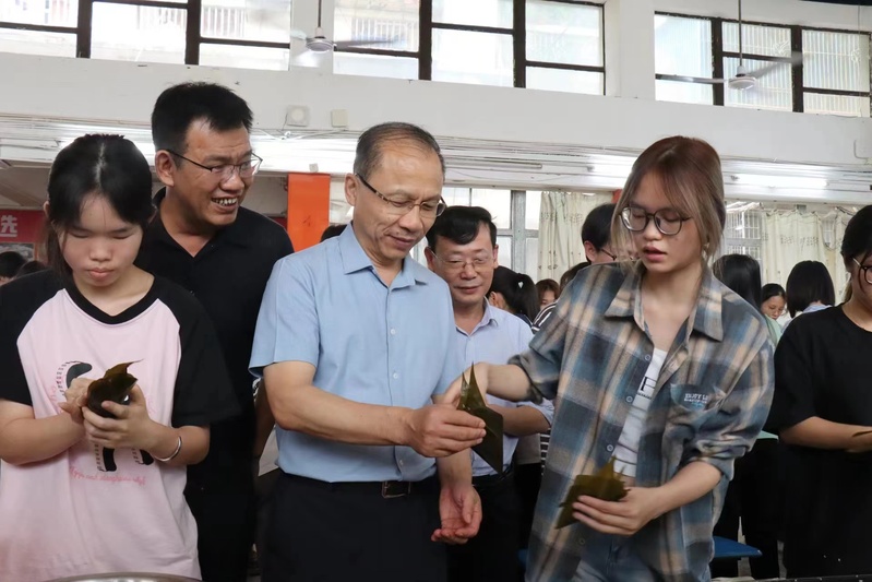 下午4点,学校党委书记王小辉、副校长陈庭照一行来到“心连心餐厅”,在同学们的热情邀请下,王小辉书记参与到包粽子的活动中。随后,王小辉书记与新疆、西藏籍少数民族同学在现场进行座谈,深入了解、关心大家学习生活情况,现场一片欢声笑语,洋溢着节日的欢乐氛围。