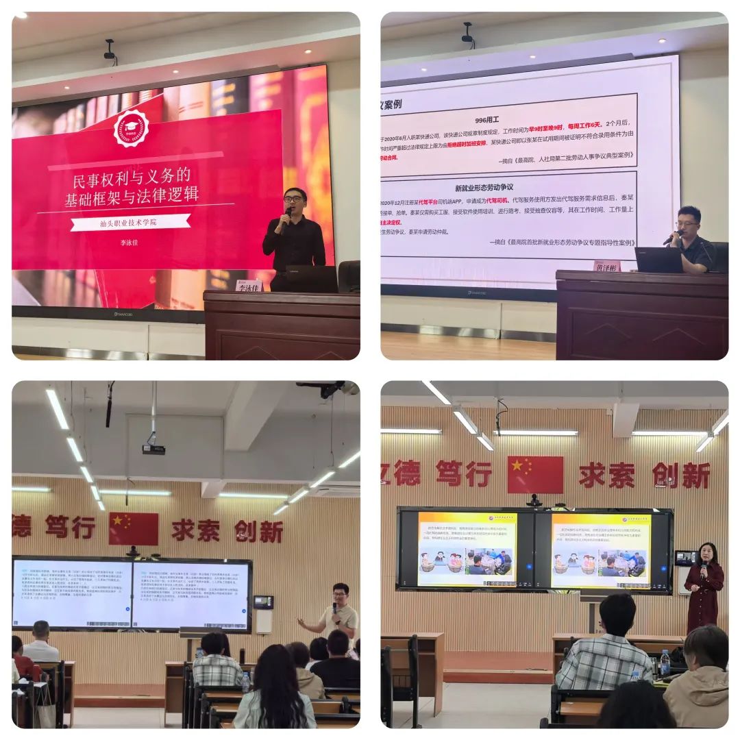 讲座中,李泳佳老师以“民事权利与义务的基础框架与法律逻辑”为题,紧扣民法典法律条文,结合典型教学案例,系统梳理民事法律关系核心要点;黄泽彬老师聚焦“就业创业‘法律体检’”,通过真实案例深度解析就业创业过程中的法律风险与防范策略,为课堂教学提供生动素材。沈育德老师以“婚姻家庭生活的法治思维”为切入点,深入浅出解读民法典中与家庭生活相关的法律规范,助力思政课融入法治教育;陈映虹老师从实务角度出发,探讨“纠纷的解决方式及其价值追求”,剖析防范社会矛盾、解决纠纷的多元路径,为教师们开拓教学新思路。