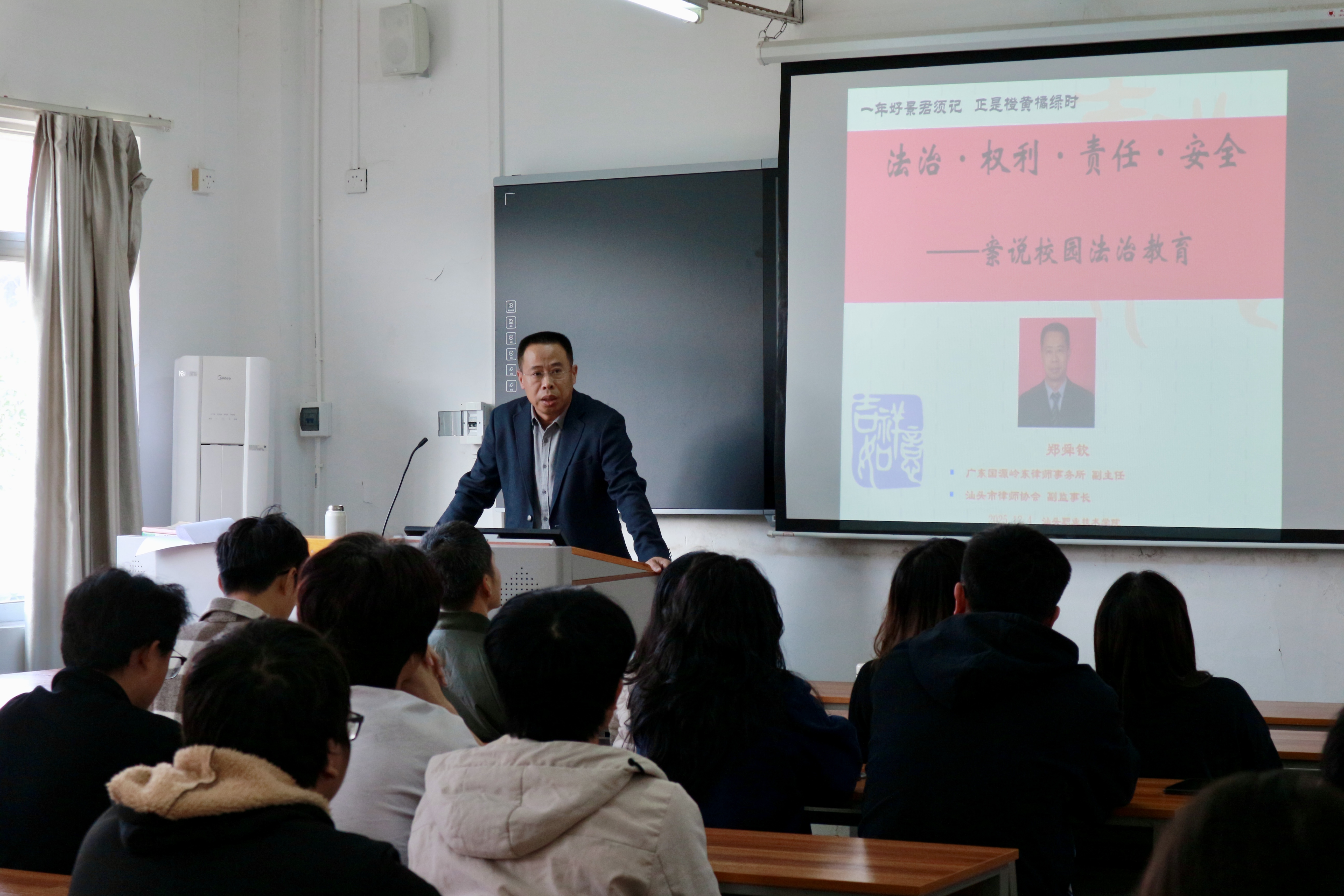 12月4日,电子信息学院特邀广东国源岭东律师事务所副主任、汕头市律师协会副监事长郑舜钦律师,开展“法治·权利·责任·安全——案说校园法治教育”主题法治讲座。