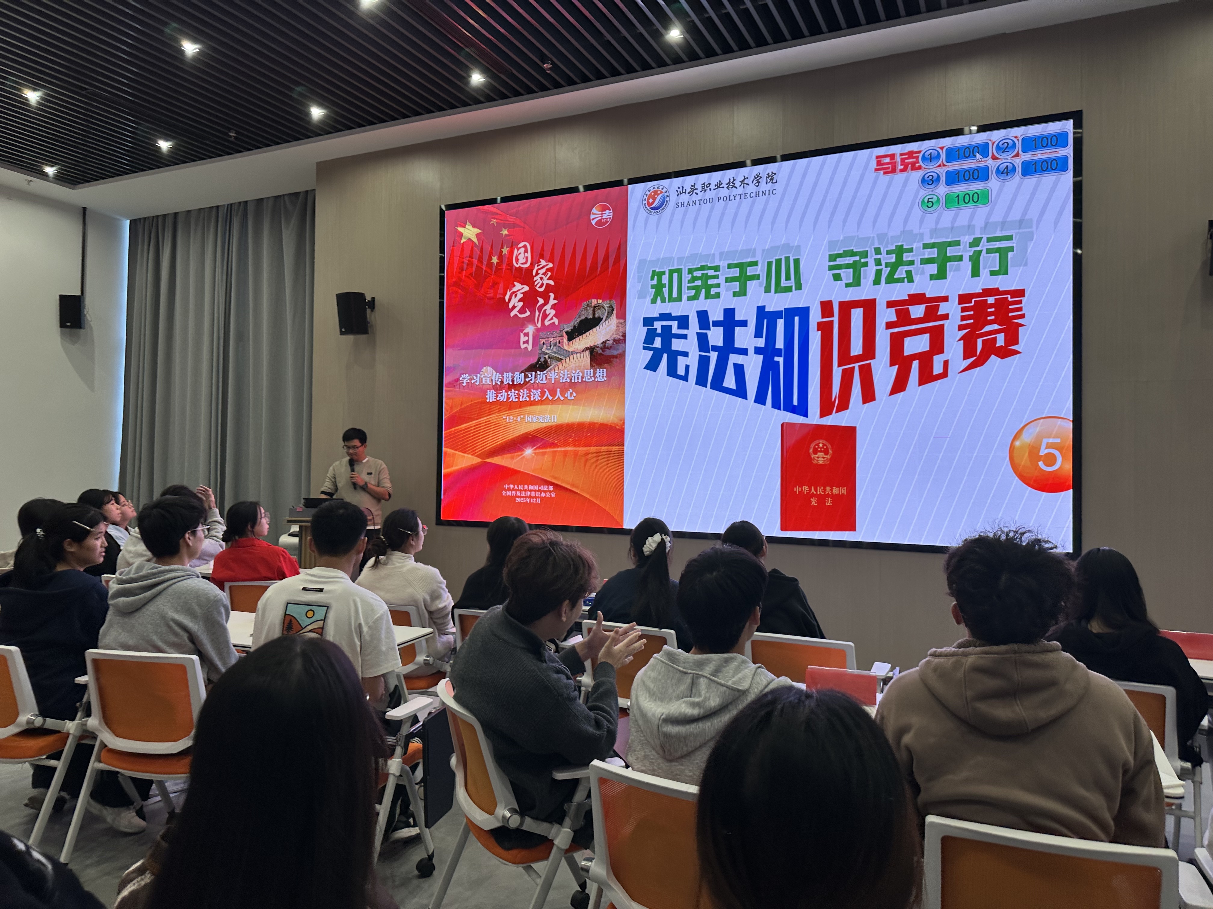 比赛现场氛围热烈,同学们思维敏捷、踊跃应答。抢答环节中,各队反应迅速、配合默契,充分展现扎实的宪法知识储备与良好法治素养;部分班级在思政导师统筹下开展跨班级联合竞赛,在互动比拼中深化理解,将现场气氛推向高潮。