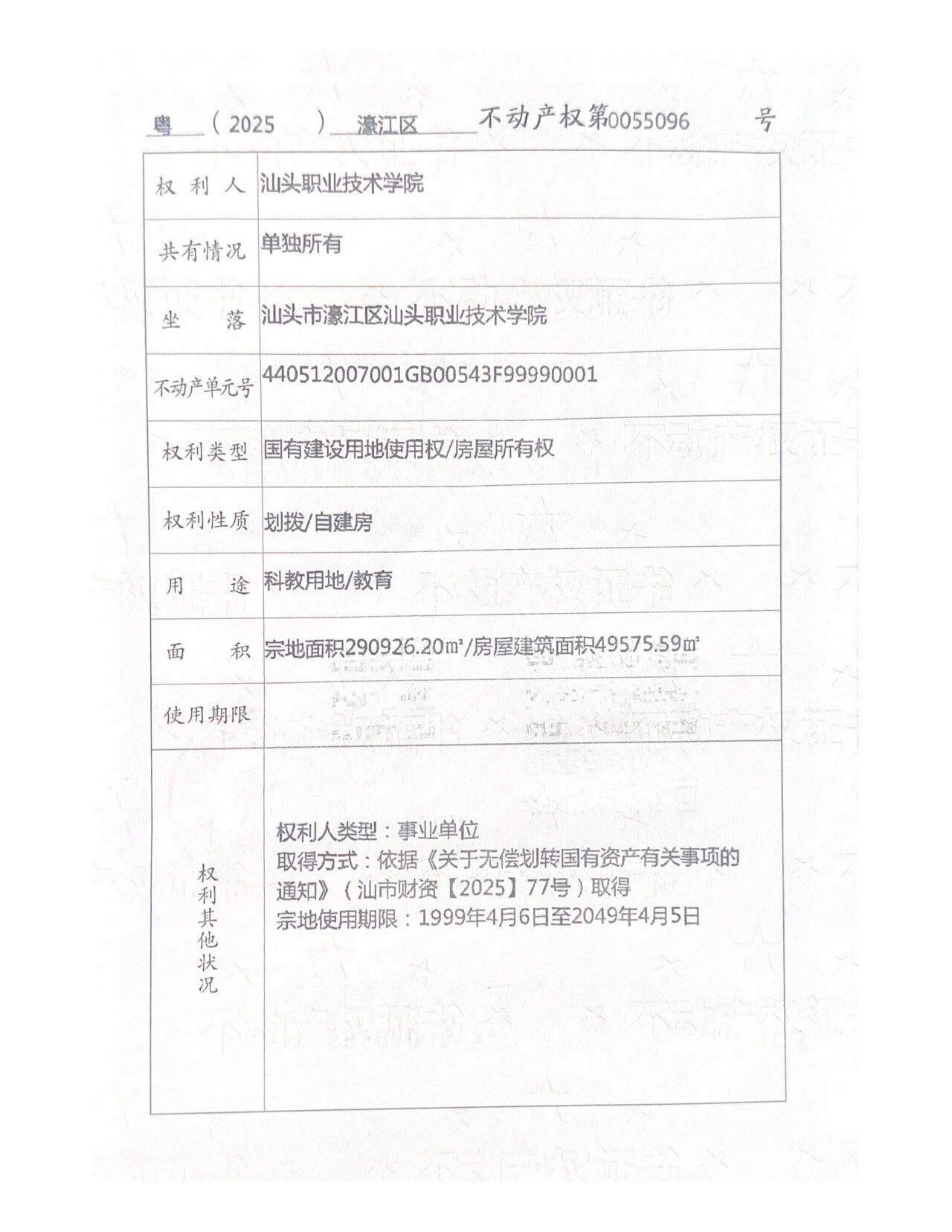 市委市政府对学校确权工作高度重视。2025年3月和4月,市委市政府主要领导听取汇报、作出指示。市政府办公室、市教育局、市司法局、市财政局、市自然资源局、市税务局、濠江区人民政府等单位攻坚克难,12月19日,学校校本部290926.20平方米的土地,以及26幢共计建筑面积49575.59平方米的建筑物,正式取得不动产证。这张迟到20余年的“安家证”,不仅终结了学校产权归属的历史遗留问题,更给学校吃下了安稳发展的“定心丸”,为学校高质量发展筑牢了坚实根基。