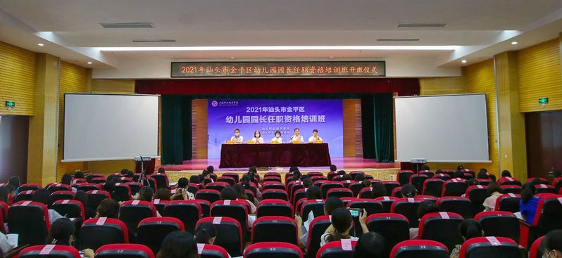 为切实抓好园长队伍建设,受金平区教育局委托,8月3日上午,2021年金平区幼儿园园长任职资格培训班在金园校区学术报告厅顺利开班。金平区教育局林兰副局长、教研室肖留青副主任、学前专干王敦同志、学院成人教育部陈锦德主任、曾瑞海副主任出席本次开班仪式,成人教育部相关人员及参加本次培训班的学员约105人参加了开班仪式。仪式由陈锦德主任主持。