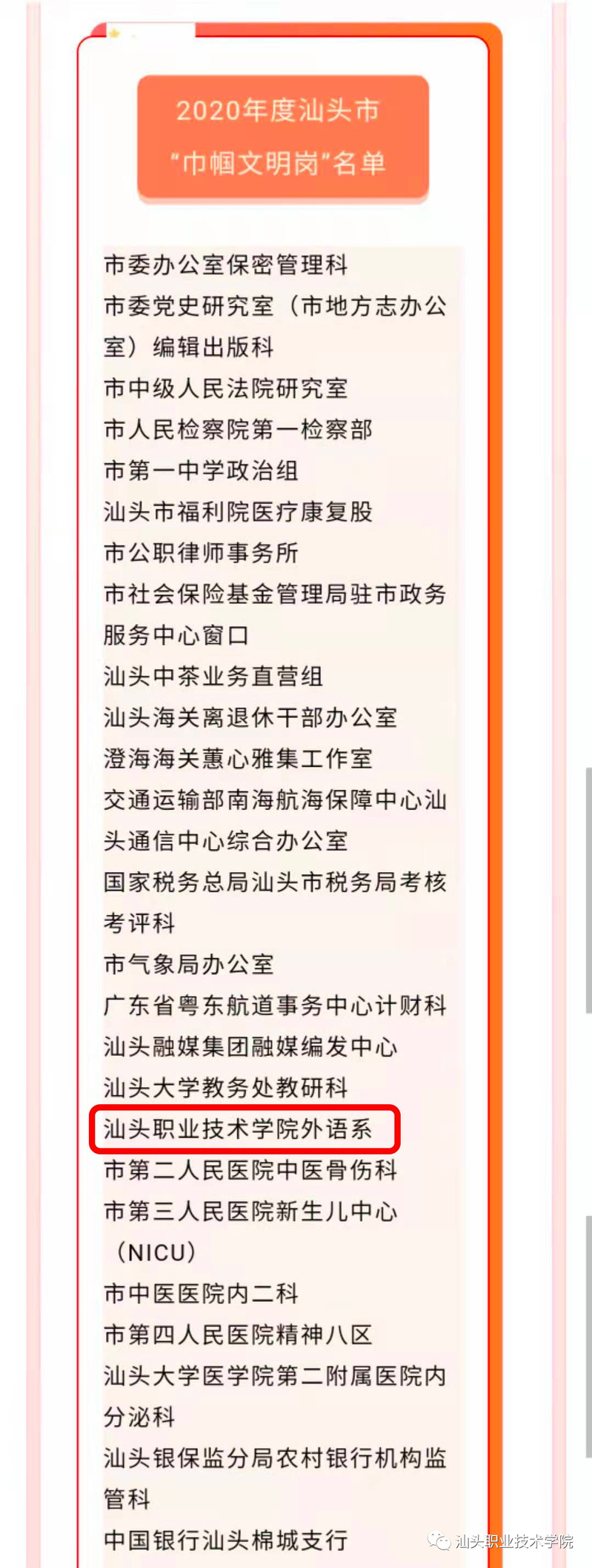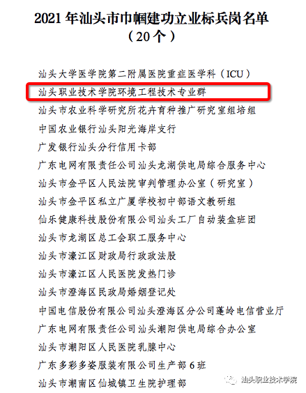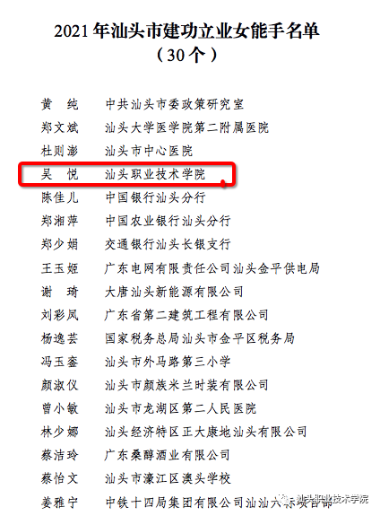 2021年是“十四五”开局之年,也是中国共产党成立100周年,在第111个“三八”国际妇女节来临之际,汕头市妇联、汕头市总工会集中对奋战在我市各条战线的优秀女工集体和个人进行表彰,我院多个女工集体和个人获殊荣:外语系荣获“汕头市巾帼文明岗”称号,自然科学系环境工程技术专业群荣获“汕头市巾帼建功立业标兵岗”称号,自然科学系吴悦老师荣获“汕头市巾帼建功立业标兵”称号。