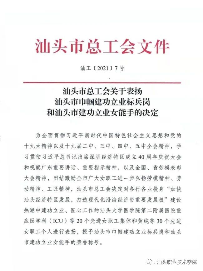 汕头市总工会关于表扬汕头市巾帼建功立业标兵岗和汕头市建功立业女能手的决定(汕工(2021)7号文)(1).pdf