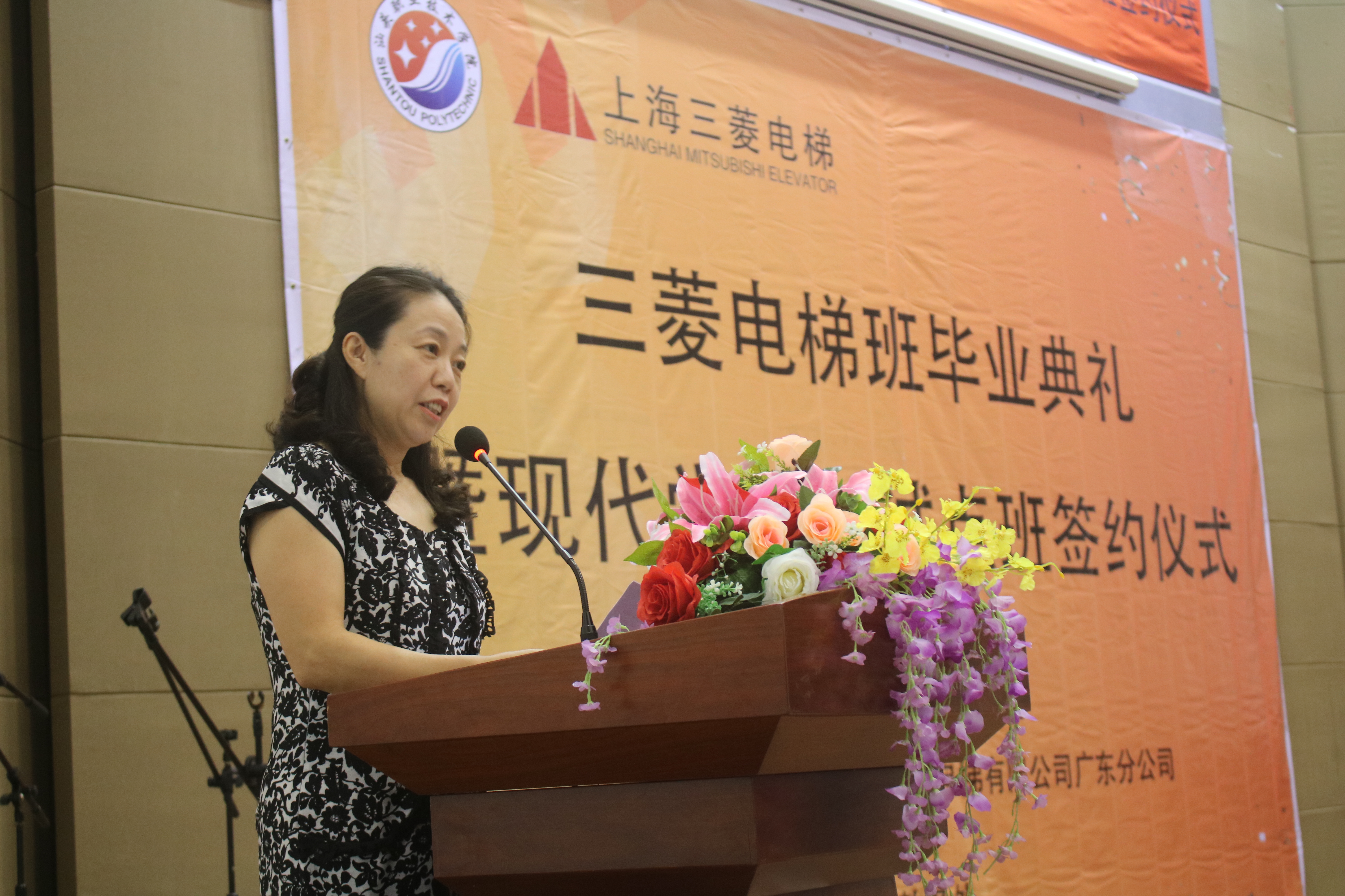 为充分展示三菱电梯班学生的精神面貌和校企合作成果,凸显学院、三菱公司对三菱电梯班的重视和关爱。6月13日下午,学院在学术报告厅举行三菱电梯班毕业典礼暨现代学徒制试点班签约仪式。上海三菱电梯有限公司广东分公司华南大区总经理高琦,上海三菱电梯有限公司汕头分公司总经理黄成志、工程部经理赵华生、综合部经理肖婷婷、维保部主管林镇水;学院院长吴萍,教务处副处长林家祥、校企合作科科长黄健新,机电工程系副主任陈明忠、系办公室主任郑遐、机械教研室主任谢志刚、三菱电梯班指导教师林惠标、方迪成出席活动;16级三菱电梯班学生代表、17级机电一体化技术专业(含17级三菱电梯班)学生、18级机电一体化技术专业(含18级三菱电梯班)学生参加活动,活动由机电工程系学生科科长曾少慧主持。