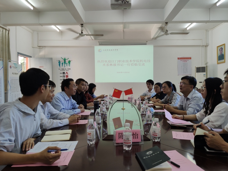 20201120日下午,江门职业技术学院机电技术系党总支书记林放一行7人莅临我院机电工程系,开展关于党建和学生管理工作的交流会。机电工程系党总支书记、主任陈明忠、专职副书记郑遐、系副主任卢旭锦、教师支部书记黄钰以及学生科各辅导员参加了交流会。