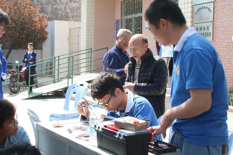 另一边,剩下的志愿者和维修队成员在门口布置现场,为活动中心修理损坏的电器,以实际行动展现机电学子的专业形象和服务精神。