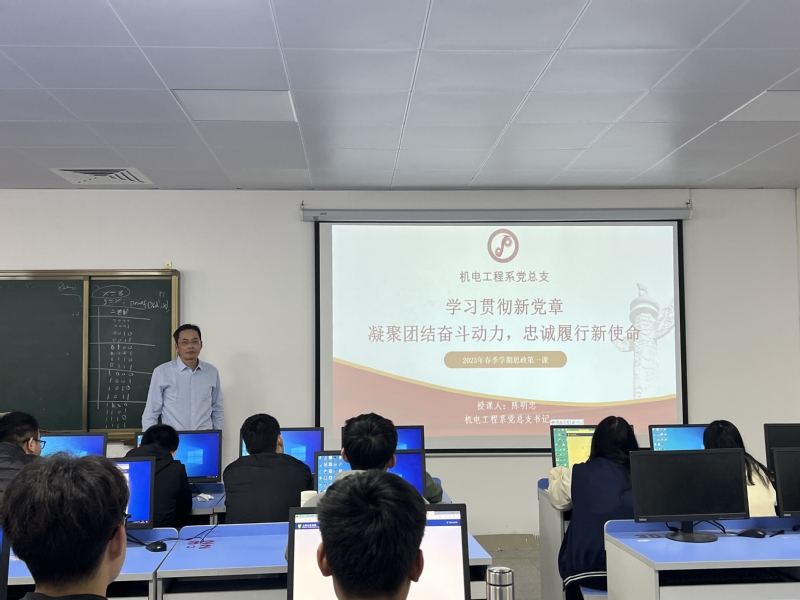 3月15日下午,机电工程系党总支书记陈明忠在第二实训楼307室为机电工程系2101级应用电子技术专业的同学们开讲了春季学期的“思政第一课”,学习贯彻学习贯彻党的二十大新党章。