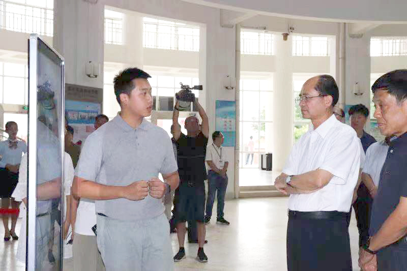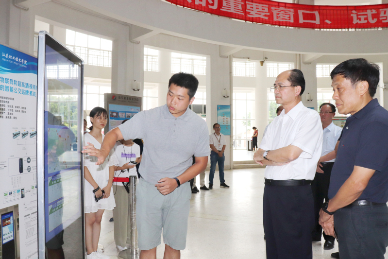 9月5日下午,在第35个教师节即将来临之际,市长郑剑戈、副市长林依民等领导一行带队到学院开展慰问活动,参观学院办学成果。图为系“优行”团队成员向市领导介绍了荣获第十五届“挑战杯”广东大学生课外学术科技作品竞赛一等奖的作品《智能公交站牌系统》。