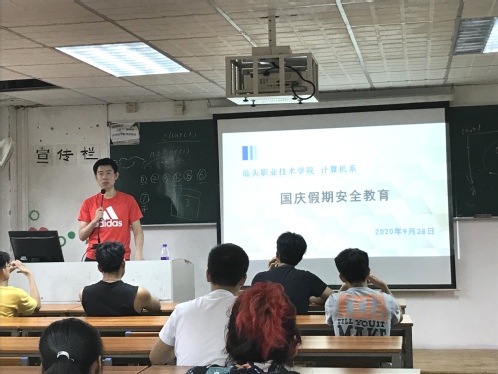 为贯彻学院发布的《关于“国庆、中秋”期间加强校园安全检查的通知》的文件精神和要求,计算机系于2020年9月28日,在教学一区A304召开“国庆、中秋”校园安全教育会议,会议由辅导员胡老师主持,学生科全体辅导员、2018、2019级各班班长参加会议,并于会后向各班同学转达会议要求。