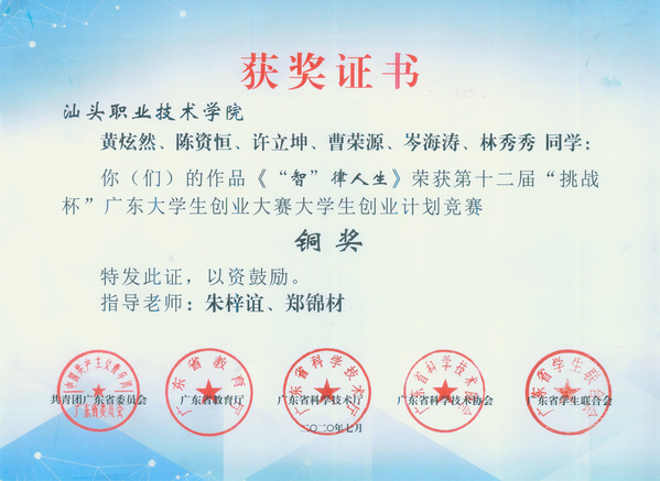 7月19日下午,由团省委、省教育厅、省科技厅等共同举办的第十二届“挑战杯”广东大学生创业大赛终审决赛在广州中医药大学(大学城校区)圆满闭幕。我系学生参赛项目《“智”律人生》一路过关斩将,荣获铜奖。