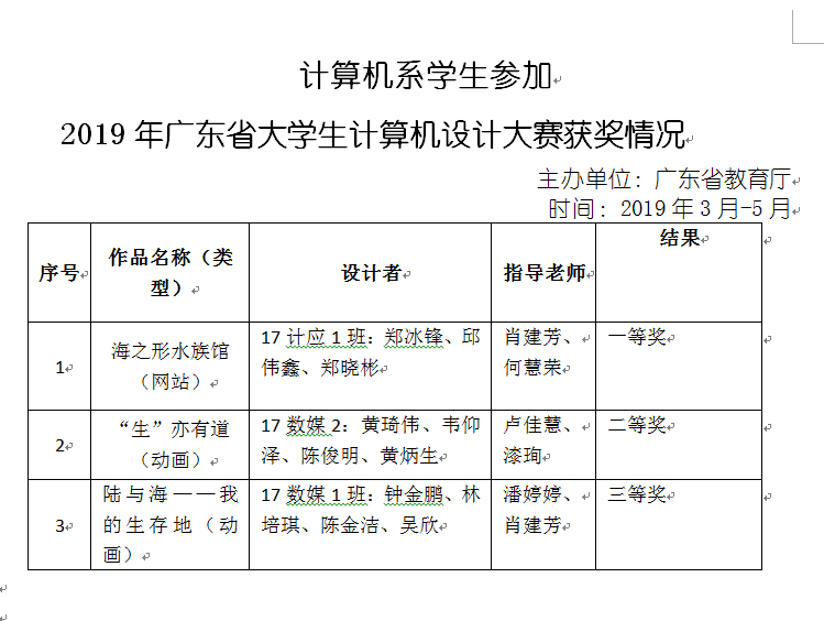 近日,由广东省教育厅主办的2019年广东省大学生计算机设计大赛在广东外语外贸大学落下帷幕。在本次比赛中,2017级计算机应用技术1班郑冰锋、邱伟鑫、郑晓彬同学的作品《海之形水族馆(网站)》荣获一等奖;2017级数字媒体技术2班的黄琦伟、韦仰泽、陈俊明、黄炳生同学的作品《“生”亦有道(动画)》荣获二等奖;2017级数字媒体技术1班的钟金鹏、林培琪、陈金洁、吴欣同学的作品《陆与海——我的生存地(动画)》荣获三等奖。